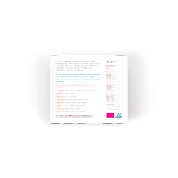 Arduino Starter Kit Classroom Pack sadrži 6 početničkih Arduino Starter setova. Zamišljen je kao cjelovito rješenje za rad s grupama učenika u nastavi te izvannastavnim i izvanškolskim aktivnostima. Uključen je i 30-dnevni probni pristup Chrombook Education aplikaciji. Svaki pojedinačni set sadrži Arduino Uno Rev 3 pločicu, kolekciju senzora i aktuatora te priručnik koji će na jednostavan način voditi korisnike pri njihovim prvim koracima u svijetu elektronike. Svaki Arduino Starter Kit sadrži knjigu na engleskom jeziku sa 170 stranica uputa i 15 projekata. |